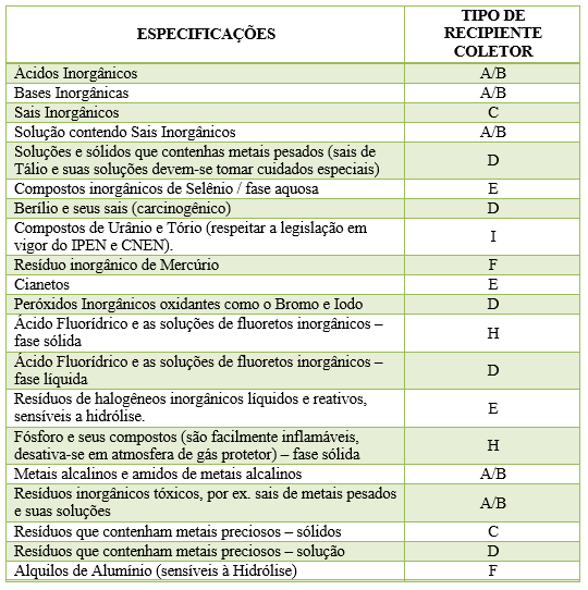 - Não é recomendado a utilização de garrafas de vidro para armazenamento de resíduos, exceto quando o resíduo for incompatível com os recipientes de plástico.